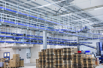 Construction of a medium-sized parts warehouse (97,000 storage locations for trays, 20 BOXer storage and retrieval machines at 19 m each), a high-bay pallet warehouse (26,600 storage locations, 7 MASTer SRMs at 34 m each) and a cassette warehouse (1,330 locations for large products) as well as kilometers of conveyor technology
