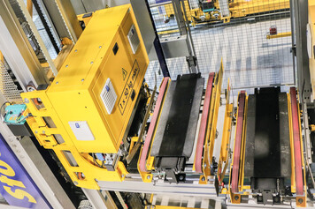 Automated BOXer system small parts warehouse (AKL) with nine aisles and one storage and retrieval machine (SRM) per aisle, four with 1-mast version of type BOXer D1 (payload up to 100 kg), five with 2-mast version of type BOXer E2, logOS MFS as control module for material flow and storage location management