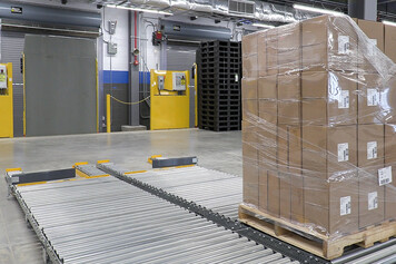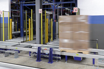 Once the products are ready for dispatch, the pallets are picked up by the stacker cranes' load handling devices and placed on a conveyor belt for transportation to the dispatch area. On arrival in the dispatch area, the pallets are moved by another transfer car to the staging area, where they are temporarily stored until trucks are ready for loading.