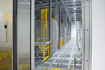 Other central components are the infeed and outfeed transport system, transfer carriages, multi-station conveyors, rope lifting devices, pallet labeling systems as well as high-speed doors and airlocks, which reliably separate the special environments (deep-freeze, fire protection). Lifts are used to transport load carriers to the workstations for order picking and customer-specific packaging and labeling. A new material flow computer (MFR) visualizes the system status in real time.