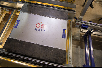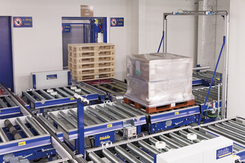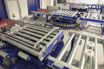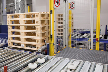 Incoming and outgoing goods are located on the first floor of the new overall system. Load units to be received are manually transferred from wooden to plastic carriers, loads are checked, secured with film by a fully automatic wrapper if necessary and transferred to the conveyor system at floor level using hand pallet trucks. Pallets are conveyed to the seventh floor (HRL) via a pallet elevator.